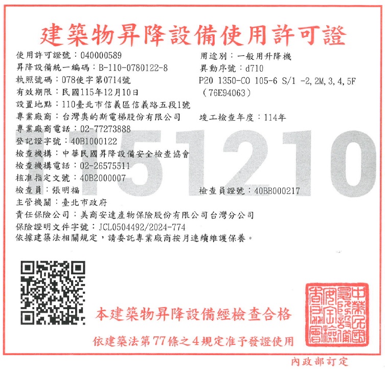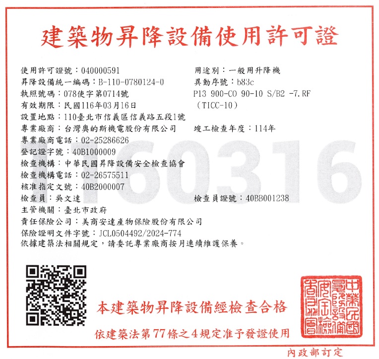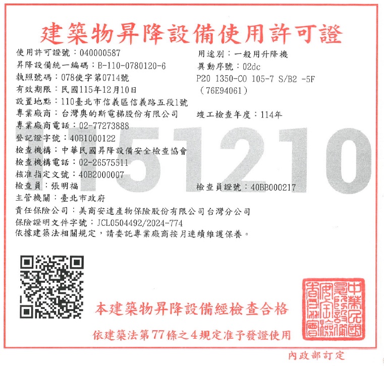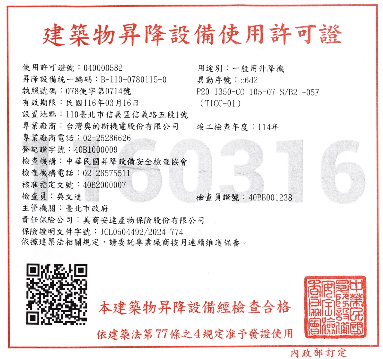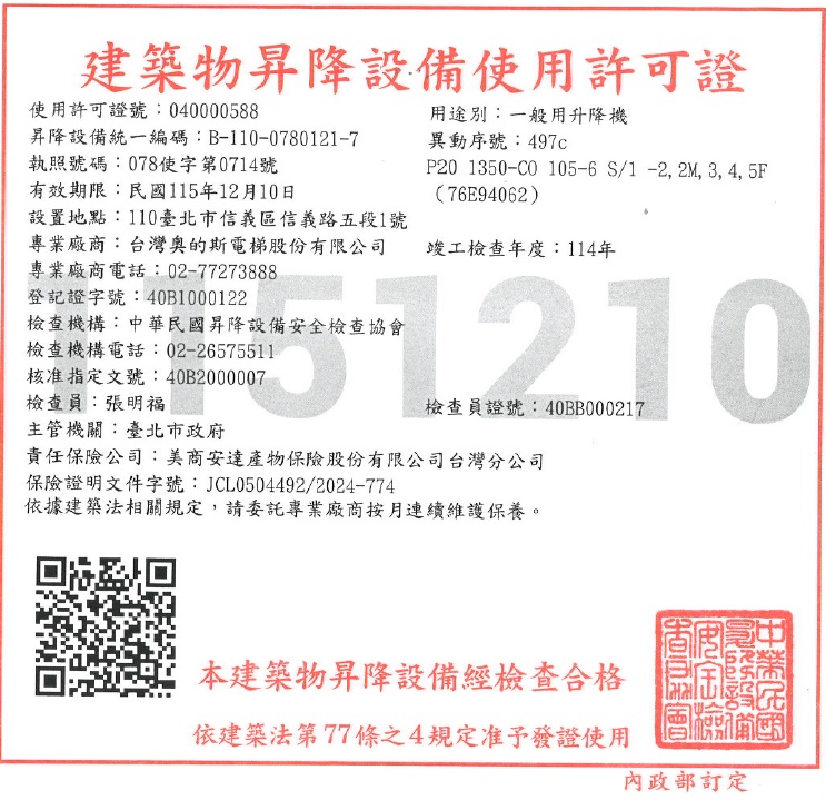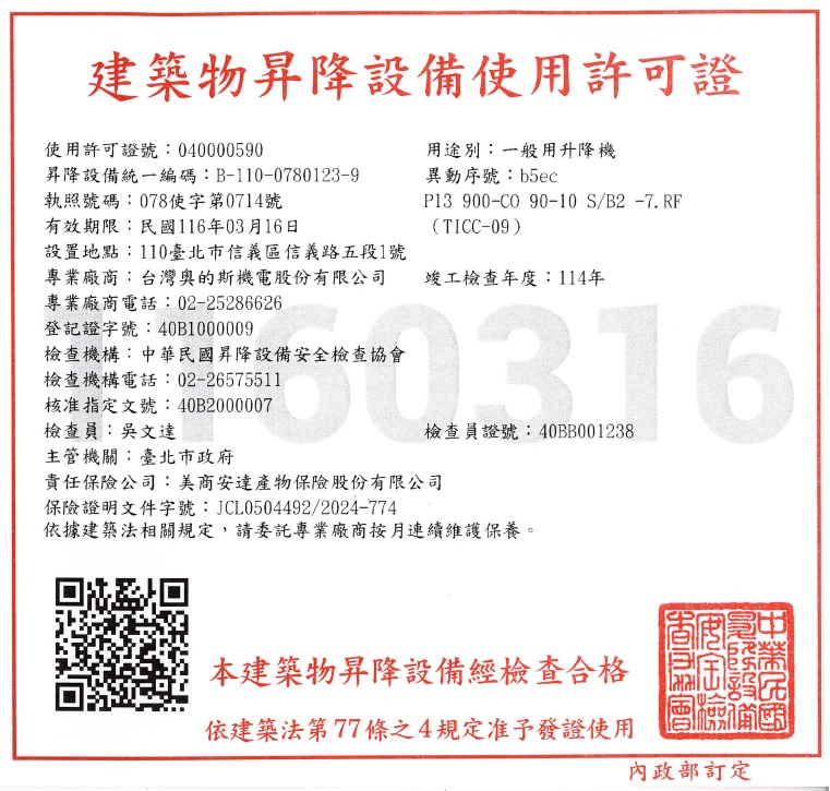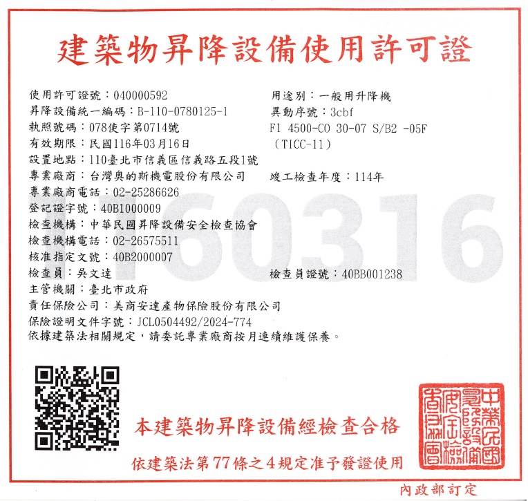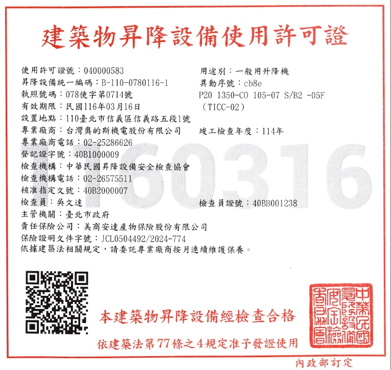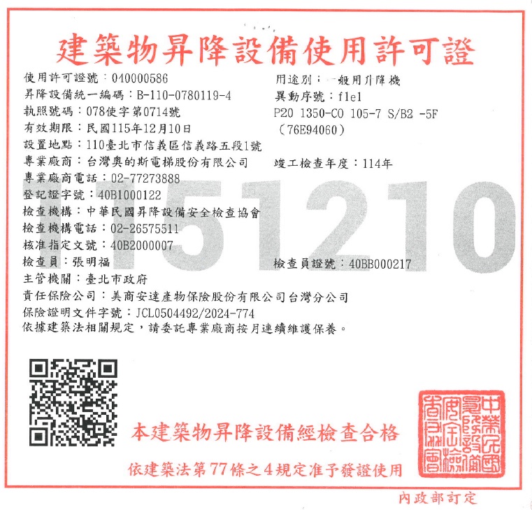 建築物昇降設備使用許可證(如相關照片)